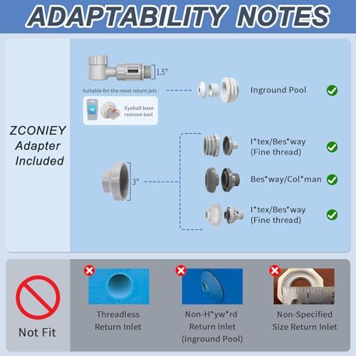 - 【Universal for Most 1.5' Pool Return Fittings】 The floating fountain design to fit most 1.5 inch MALE & FEMALE THREADED pool return jet fittings. The additional adapter can fit 1-1/2-inch external return jet and 2.2 inch external return nozzle. Please measure your in ground and above ground pool’s return port size before ordering.