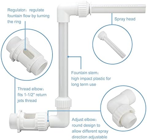 - 【Cool Funny water fountain for Pool】 Smart design allow water fun sprinklers fully adjustable spray direction and powered by your existing pool pump, the spray height up to 14ft, depending on the pool pump used. Can work without pump, but with 3/4 hp or larger pump for better waterfall splash. To prevent leaking, be sure to tighten the connecting parts securely. Please contact us for further help, or if you have any questions regarding installation or returns.
