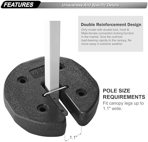 - Interlocking weights securely fit all canopy (Square leg only, not applicable to other shapes) poles up to 1.1 inch wide.