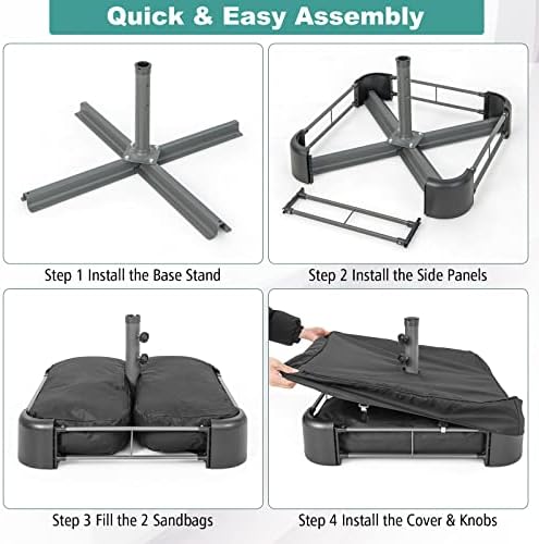 - Two Sandbags Included: Two sandbags are made of durable oxford fabric which is durable and water-proof for outdoor use. Designed for outdoor patio umbrella, this umbrella base stand can weigh up to 220 pounds for 2 bags when filled with sand, and keep umbrella stability in windy conditions.