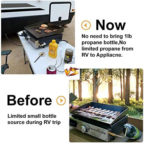 - Upgrade Your RV And Multipurpose: 1,Allows You to Use the Propane Hose Quick Connect From the RV and Hook Up to Your 17'/22' Griddle. 2,You Can Take Off the Propane Elbow Adapter Fitting and Hook it Up to Your Grill, Stove, Fire Pit, Propane Heater and Most Appliance With 3/8' Male Flare.