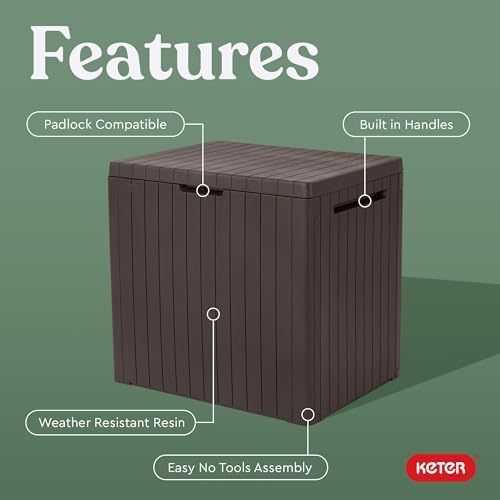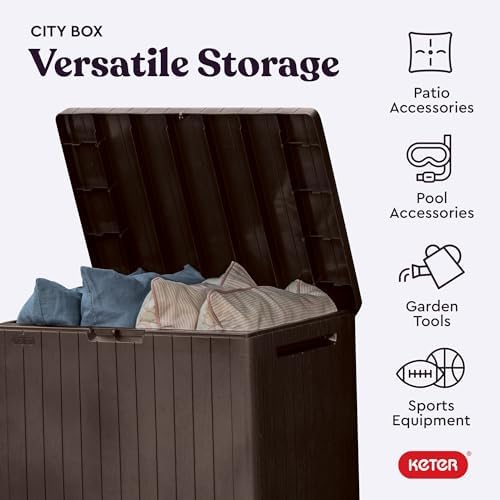 Keter City 30 Gallon Resin Outdoor Storage Box and Patio Furniture Side Table for Pool and Garden Accessories, Brown