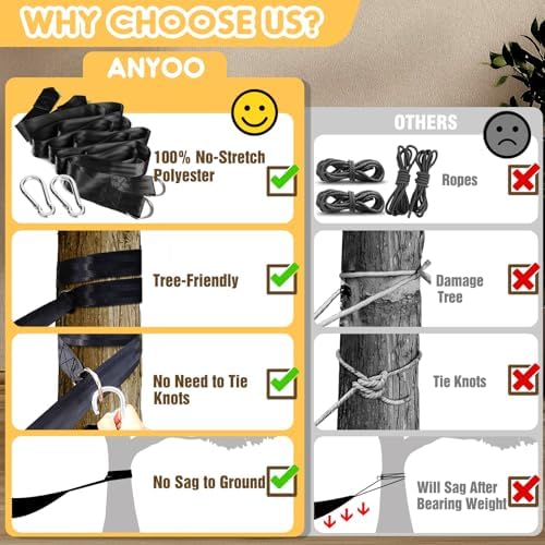 - Suspension System: It comes with tree-friendly high-density nylon straps and 2 carabiners, which makes it easy to set up and take down the hammock without damaging the trees. This type of suspension system used will bring you more comfortable and relaxing experience.The hammock structure is sturdy enough to support the weight of the hammock and its occupants