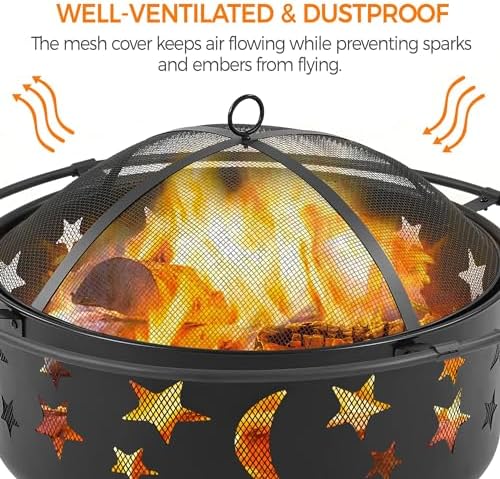 - Adorned with Celestial Designs: Embracethe magic of starlit nights with this fire pit, adorned with an irregulararrangement of cut-out designs featuring stars and moons. This round fire pitcaptures flickering firelight and casts enchanting shadows that enhance thefire pit's captivating aesthetic