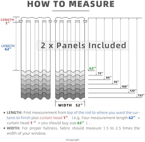 - 【Ready Made】- Includes 2 x Curtain Panels. Each panel measures 52' wide. Available in 63', 72', 84', 95', 108', 120' and 132' lengths. Each grommet has 1.6' inner diameter that fits well most standard curtain rods. The rust proof loops are easy to install, and give the curtain years of use without tearing up edges. Please measure size before buying.