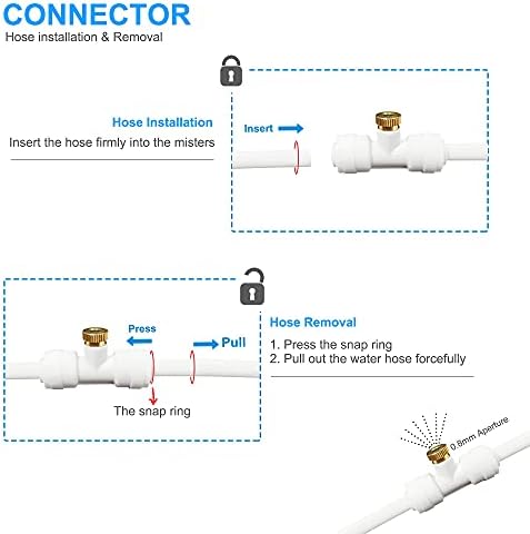 - 【Easy to Install — Rapid 1-Second Push-to-Connect Fittings】 Simply push cut tubes into quick-connect fittings for a weatherproof seal misting system. No glue, no frustration—just fast & firm connections. Saddle clamps and zip ties lock tubing to fences, railings, string lights, ceilings, or any surface.
