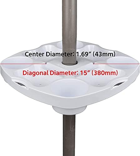 - 【Size & Compatibility】This umbrella tray has a diameter of 15 inches and is patent pending. It is universally compatible with umbrella poles ranging from 1 inch to 1.5 inches in diameter. ▼Each package includes one 15-inch umbrella tray and one umbrella pole adapter fastener with screws. ▼Available color options include White, Grey, Pink, Yellow, Blue, and Green.