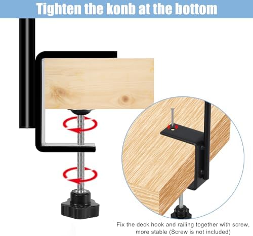 - 【Easy to install】The deck hook is easy to assemble and sturdy. You can put it together without any tools in just a few minutes. And you can either attach the base with a bolt, or use the supplied tightening screw. The vertical clamp can be mounted to your deck railing or balcony.