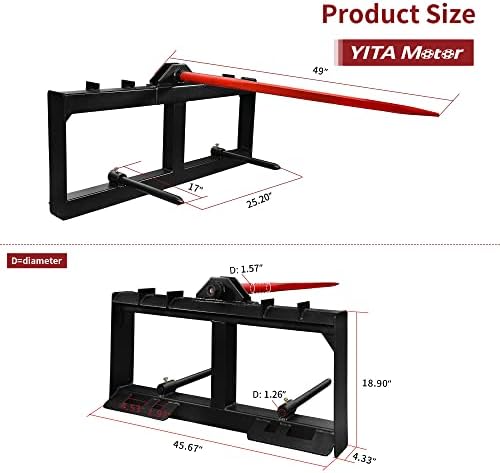- Specifications: This hay bale spear is 49' long and 45.67' wide; Spike is 49'' in length; Comes with a pair of 17'' stabilizer spears; Weighs about 126.4 pounds, Capacity: 3000lbs.