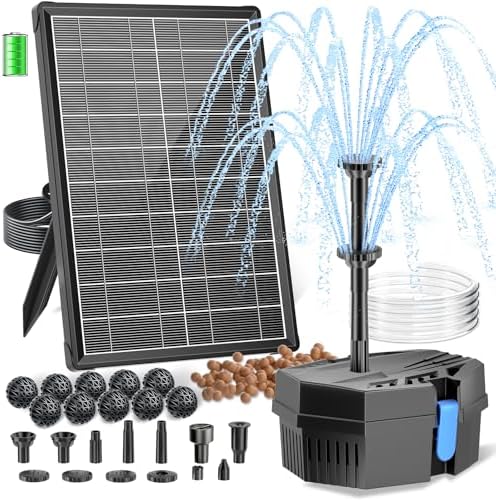 - DIY Water Features: Solar fountain pump with filter box have 10 different nozzles and tubing, easy create multi fountains water features, adding a touch of romance to your garden. Built-in dry-run protection's pond pump will auto stops working when the water level is low