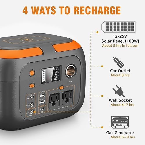 - 【Multiple Charging Outputs Provide More Options】 It is equipped with 2*AC outlet(110V 300W), 2* USB ports, 1*USB-C, 2*DC ports, 1*car port and 1*10W wireless charging port. Deliver stable and security power to most of your devices (less than 300W) like laptops, phones, cameras, drones, light, CPAP machine etc. Ideal for outdoor activities(camping, RV trip, fishing, hunting, boating) and home emergency(power outage, hurricane)