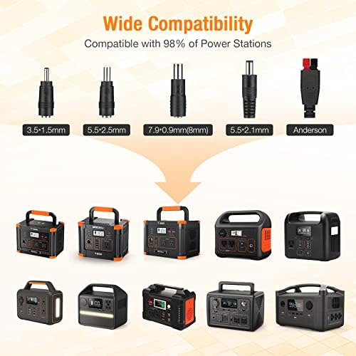 - MADE FOR SOLAR GENERATOR--GRECELL 100W solar panel comes with a connector (can deliver 25A(max)current), 8mm/5.5*2.5mm/3.5*1.35mm/5.5mm*2.1mm DC adapter/Anderson Cable, compatible with most solar generators/portable power stations on the market(Jackery,Ecoflow,Bluetti,Paxcess,Suaoki, Flashfish portable generator, etc). Includes different sizes of connectors perfect to charge our GRECELL portable power stations as RV camping emergency power.