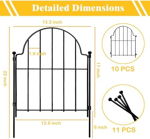 - 【Upgraded Garden Fence】 Classic arch shape design garden fencing single piece size height is 22 inches(5'' stakes in soil), length is 12.6 inches, and the fence gap is 1.9 inches, total 10 pieces of fence, overall length about 11 ft. Equipped with 11 Pcs height of 17 inches metal stakes. More convenient installation. This fence will be the best choice for your beautiful garden, yard & patio!