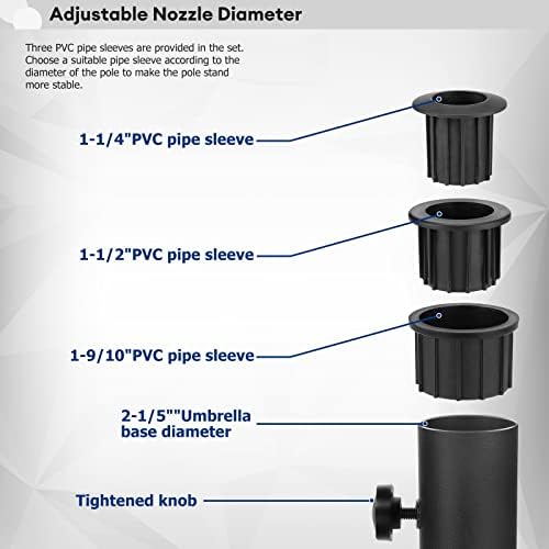 - ADJUSTABLE NOZZLE DIAMETER: Three PVC sleeves are provided in the set. Sizes are 1-1/4'(32mm), 1-1/2'(38mm), 1-9/10'(48mm). Choose the appropriate tube sleeve according to the diameter of the umbrella pole, and then tighten the two on the stone umbrella tube holder Secure the knob so the umbrella pole doesn't wobble even on a windy day.