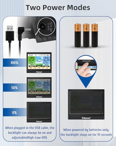 - 【Customizable Hi/Lo Alert】 Geevon weather station wireless indoor outdoor designed with temperature and humidity alert function which informs you the bad climate conditions and remind you to take proper action to protect families health in time by setting the high/low values of temperature and humidity. It also displays the maximum and minimum records for the past 24hrs.