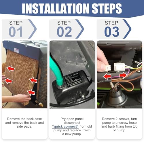 - EASY INSTALLATION - ①. Remove the back case and remove the back and side pads; ②. Pry open panel disconnect “quick connect” from old pump and replace it with a new pump; ③. Remove 2 screws, turn pump to unscrew hose and barb fitting from top of pump