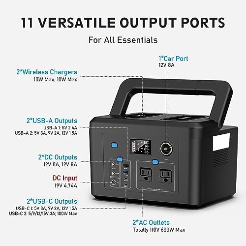 - CAMPING BATTERY WITH MOST PORTS: The outdoor backup lithium battery features 2 x AC outlet (110V 600W in total), 2 x USB-A port, 2 x USB-C port, 2 x 10W Wireless Charger, 2 x 12V DC port and 2 x charging port (USB-C, DC). Our portable power generator with wireless charger, you can easily charge 2 mobile phone without cable at the same time