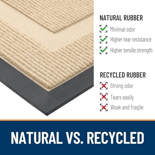 - [STURDY NATURAL RUBBER BACKING] The OLANLY heavy-duty door mat features a 0.2-inch ultra-thin design, allowing it to effortlessly glide under most doors without jamming or curling. Crafted with a sturdy natural rubber backing, our product offers higher tensile strength, increased tear resistance, and less odor compared to synthetic rubber.