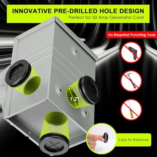 - Unmatched Performance: 50 amp generator power inlet box has been perfectly upgraded. It is equipped with 4 large holes, making it easy to remove knockouts without the need for any drilling tools. The 50 amp generator cord is designed with all-copper wires to ensure exceptional conductivity. The high-density PVC jacket offers amplified durability, along with waterproofing and UV resistance. As an ETL Listed product, it provides complete peace of mind.