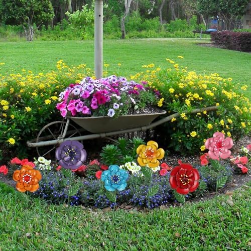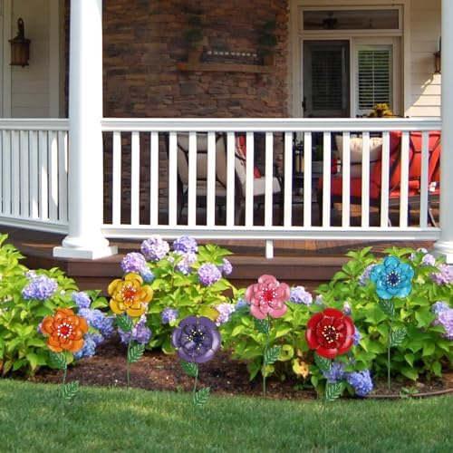 - 🌼【BRIGHT UP YOUR GARDEN】 This adorable set of Garden Stakes will add the perfect charm to your planters, raised garden or landscape beds. Each Whimsical flower measures approximately 3.5 inches and stands 11.6 inches tall. Vibrant metal flower set will bring a boost of color to any yard or garden! Guests in your garden won't be able to miss these beautiful and unique metal flower garden stakes!