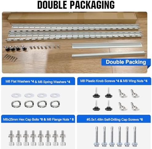 - [ Package Includes ] - Four (4) 1140mm/45in Aluminum Mounting Rails*2, Two (2) 570mm/22.3in Aluminum Tilt Bracket*2,Four(4)M8 Flat Washers *2 & Four (4)M8 Spring Washers *2,Four(4)M8 Plastic Knob Screws *2 & Four(4)M8 Wing Nuts *2,Eight(8)M8x25mm Hex Cap Bolts *2 & Eight(8)M8 Flange Nuts *2,six(6)#5.5x1.49in Self-drDilling Cap Screws*2