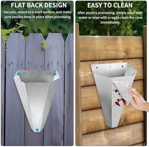 - 【Flat Back Funnel Cone】The flat back design of the cone likely allows for secure attachment to a work surface, ensuring that it stays in place during the processing of poultry.
