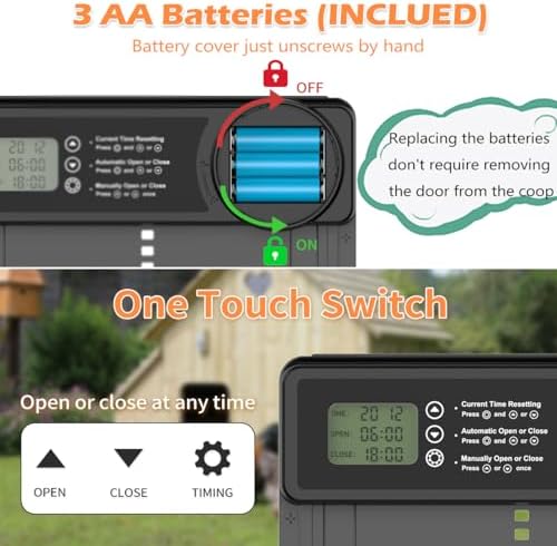 - 【Energy Efficient】Battery power is another great feature of this electric coop door. It doesn't require complicated wiring and you don't have to worry about a power outage causing a malfunction. Unlike other coop doors, there is no need to use a screwdriver to open the battery cover, just twist it gently to open it, which is more convenient. Powered by 3 x AA batteries (Included), the display flashes to remind you to change new batteries when they are around consumed