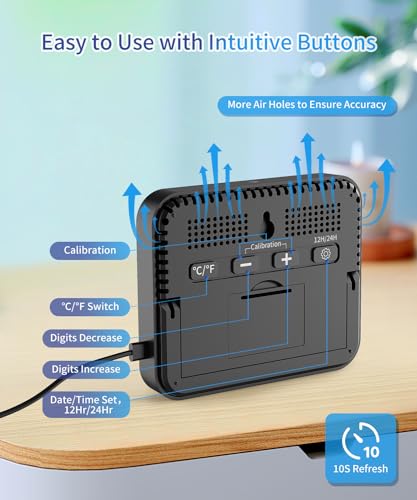 - Home-Use Accuracy & Fast Refresh: Temperature range 14.2˚F~158˚F(-9.9℃~ 70℃) with ±1℃ accuracy and humidity range 10% ~99% with ±5%RH accuracy. The inside sensor detect changes in temperature and humidity every 10 seconds to provide you the latest readings. NOTE: Temp below 14.2˚F or above 158˚F, it displays LL˚F/HH˚F to reminds you the temp is too Low/High