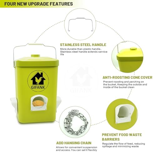 - 22-POUND AUTOMATIC CHICKEN FEEDER- GIFANK Chicken Feeder uses an automatic gravity system to replenish feed, The newly upgraded Chicken feeder port adds baffles to minimize feed waste and confusion.The top is widened and rainproof to effectively keep feed dry.