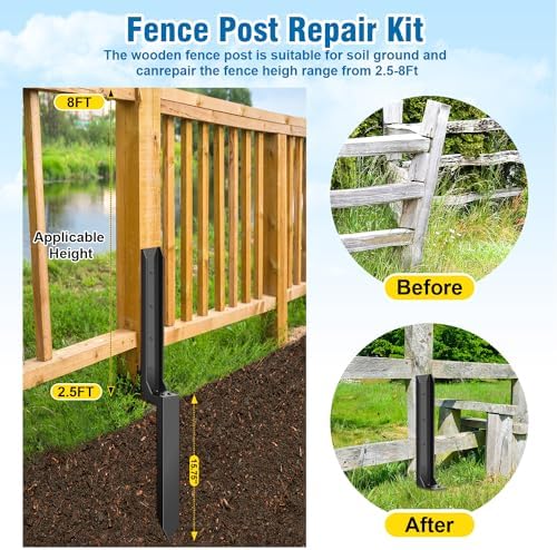 - Premium Material : Our fence post repair stakes are made of heavy-duty steel and features a powder-coated surface that makes it rust proof, and resistant to wear and tear.Provides strong support and keeps the fence post straight, even in high winds. Not suitable for concrete floors