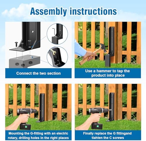 - Installation Steps : Connect the two parts together, use a hammer to drive the repair pile into the soil, and fix the repair bracket to the wooden fence by tightening the screws. If the screws are loose, please tighten them again