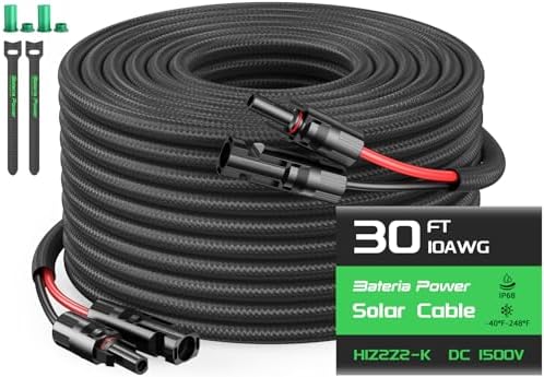 10AWG 30FT Solar Panel Extension Cable, Flame Retardant Protective Sleeving,Bateria Power Twin Wire 10 Gauge Solar Cable with IP68 Female & Male Waterproof Connectors, Dust Caps for Home, RV