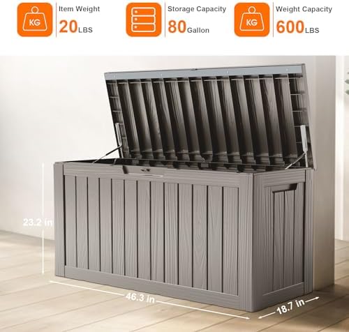 - PRODUCT DIMENSIONS: This outdoor deck box boasts a 80-gallon capacity, measuring 46.3''L x 18.7''W x 23.2''H, with a net weight of 20 lbs. It can withstand a weight of up to 600 lbs, making it the ideal choice for storing small items