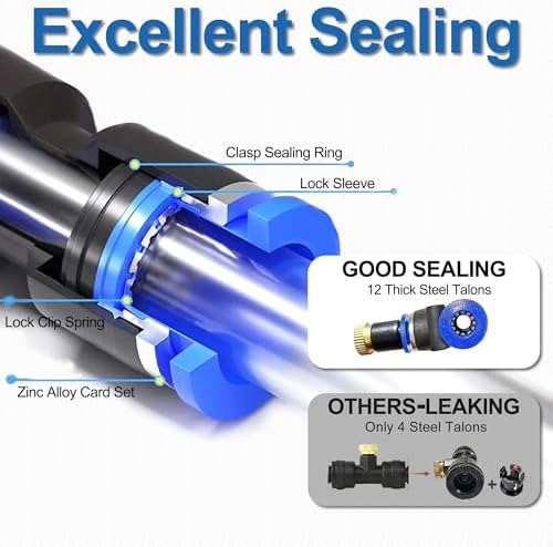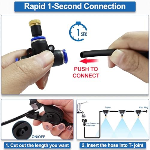 - 【Easy to Install — Rapid 1-Second Push-to-Connect Fittings】Simply push cut tubes into T-joint fittings for a weatherproof seal misting system. No glue, no frustration—just fast & firm connections. Saddle clamps and zip ties lock tubing to fences, railings, string lights, ceilings, or any surface.