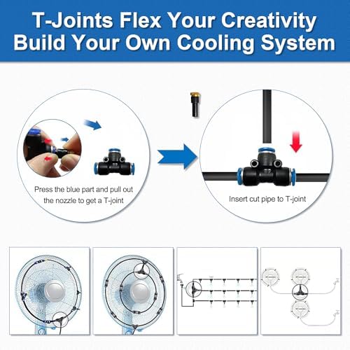 - 【Flexible T-Joints = More Creative Cooling Design for YOUR Home】Unlike basic 2-port misters, Triple-port connections (T-Joints) allow parallel misting lines, and branch tubing to multiple fans for expanded outdoor mister coverage. Perfect for yard, backyard, patio, decks, gardens, greenhouse or pergolas! Your creativity, our flexibility!