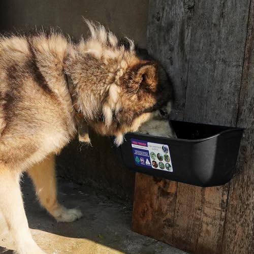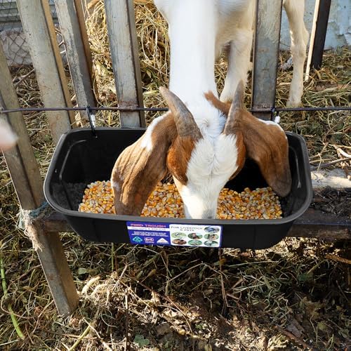 Goovilla Large Feed Trough, Hanging or Screw-in Fence Feeder with Clips, 2 Pack 9 Quart Goat Feeder Supplies, Dog Horse Hog Pig Livestock Poultry Plastic Feeder Trough Bucket for Large Animal, Black