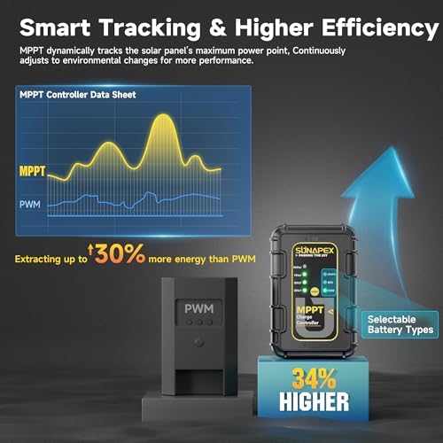 - Upgraded MPPT Controller: Outperforms PWM controllers with faster charging and higher currents. Features 4 battery status indicators and precise charging modes for LiFePO₄; GEL and AGM batteries