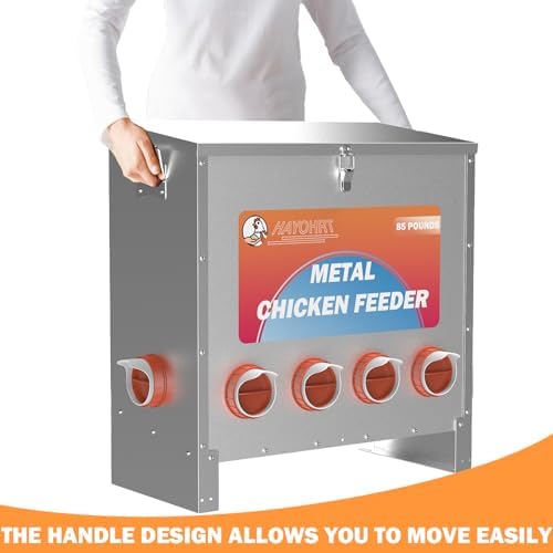 - LARGE CAPACITY: Automatic poultry feeder can hold 85 pounds of feed, chicken feeder is enough for 6 adult chickens to eat at the same time for about 50 days. Save your feeding time. No burden when traveling far away.