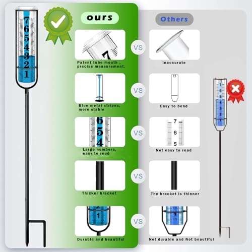 - Clearer and Easier to Read---The scale on the rain gauge tube is upgraded to large font and ten equal parts per inch, which is more accurate, clearer and easier to read. In addition, our rain measure gauge adds colored metal strips (patented design) at the rear of the tube to make the water in the rain gauge blue, effectively avoiding the problem of unclear water level and scale caused by reflection or transparency. These designs can make the precise rain gauge for yard easier to read.
