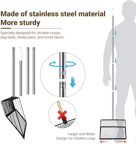 - Heavy chicken coop scooper: Constructed from stainless steel, offering increased solidity compared to wooden handles, designed specifically for chicken coops, dog beds, sheep pens, and horse farms.