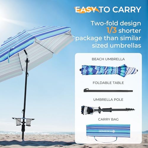 HOMEDEMO 7ft Beach Umbrellas For Sand Heavy Duty Wind, Portable Beach Umbrella UPF 50+ Windproof Outdoor Beach Umbrella with Sand Anchor, Tilt Pole, Carry Bag, Table Tray, Vent and Hook
