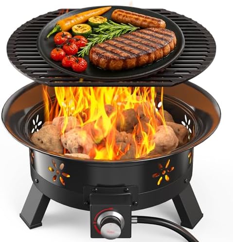 AMADA HOMEFURNISHING 19″ Propane Fire Pit with Grill Grate, 58,000 BTU, Folding Legs, Propane Tank Holder, Cover, and Carry Strap, No Ignition Needed, Easy Flame Adjustment, CSA-Certified, Portable