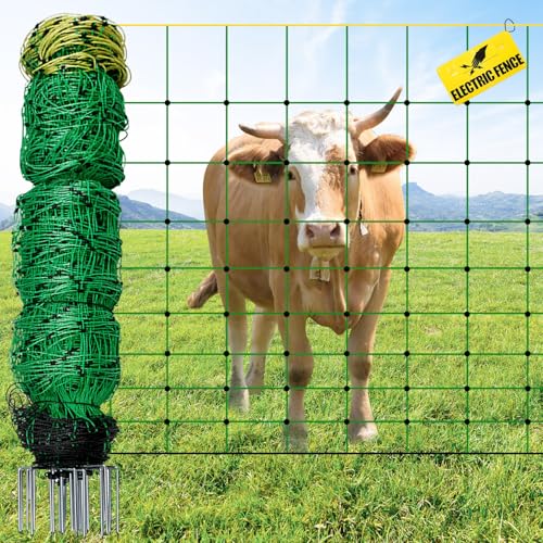 Electric Fence Netting, 49.6" H x 164'L Portable Livestock Nets for Cattle, Sheep, Goat, Hogs, Larger Animals, Electric Fencing with 14 Pre-Assembled Double-Spiked Posts for Backyards, Ranches, Farms
