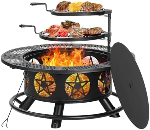 - [Beautiful & Humanized Design]OutVue fire pit table comes with 2 height-adjustable and 360° swivel grills which disassemble freely. You can barbecue, keep food warm or put pan to cook on them. The side of wood-burning fire pit is created with classic stars cut-out design which catches firelight for creating fun shadows. The drilled design promotes airflow and keeps the fire strong. All sophisticated designs of the fire pits for outside are dedicated to the warmth and comfort for you.