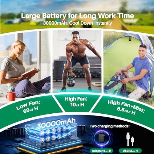 - ⭐ 【30,000mAh Built-in Battery】 – With its built-in 30,000mAh rechargeable battery, this battery fan comes with a USB charging cable (12H to fully charged) and a fast-charging adapter(6H to fully charged) . Delivering 6-7 hours of fan&mist runtime or 10-62 hours of only fan runtime. it’s perfect for extended outdoor work or vacation essentials.
