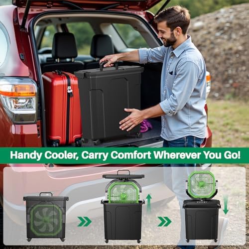 - ⭐【Dual-Purpose Water Bucket】- The portable fan is housed in a 9L bucket, which doubles as a storing and carrying case when not in use. During use, the bucket acts as a water tank, with the built-in pump supplying water to the mist nozzles. The bucket has caster wheels at the bottom, making it as convenient and practical as a suitcase for easy transport.