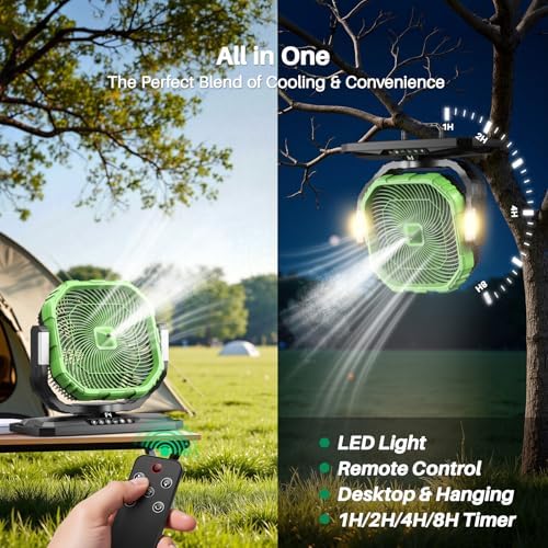 - ⭐ 【Versatile Outdoor Fan】- This versatile fan is designed for total outdoor flexibility. It features dual brightness modes (soft glow or bright beam) to light up your camping, BBQ, or emergency nights. You can stand it on the ground, place it on tabletops, or hang it effortlessly from trees, RV bars, tents, and more! A must-have summer essential for outdoor adventures.