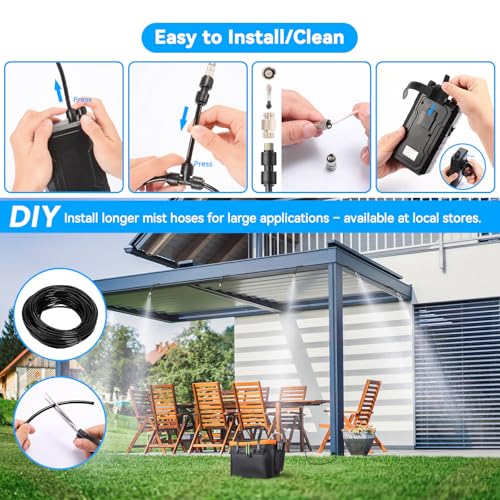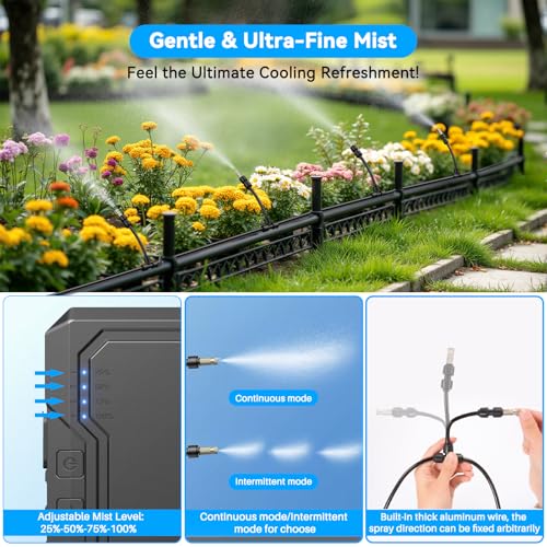 - ⭐【Cooling the Heat,Must-have Summer Essentials】- This portable misting system is perfect for cooling outdoor spaces in summer! Its fine water mist absorbs ambient heat, lowers temps by 5-14°F(3-10°C), and maintains a comfortable 77°F(25°C). Great cooling ideal for patios, fans, umbrellas, pets, and sports, etc.; hydrating ideal for greenhouse plants; or reduces dust and boosts humidity. Stay cool all summer!