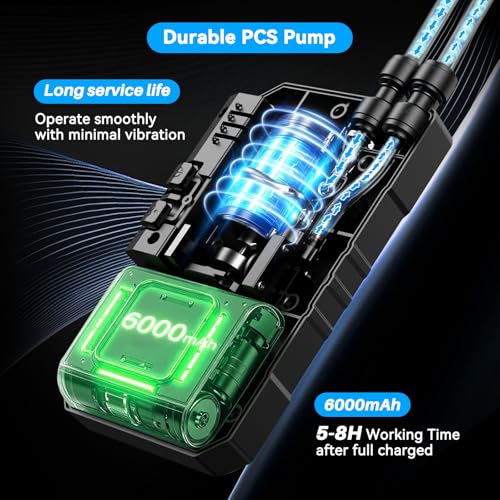 - ⭐【6000mAh PCS Pump】- This high-performance cooling system features a German-engineered PCS pump for efficient operation and enhanced durability. With a built-in 6000mAh rechargeable battery, it delivers 5-8 hours of continuous misting—perfect for extended outdoor use on canopy tents, patio umbrellas, and other summer essentials.