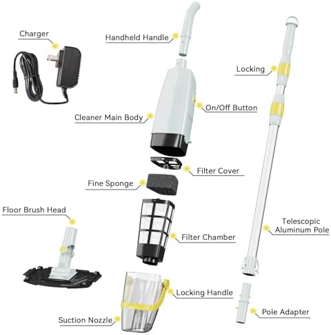 - Cordless & User-Friendly Design: Lightweight and compact, this handheld pool vacuum offers effortless maneuverability, eliminating the hassle of tangled cords and hoses. The push-button operation makes it easy to use, while the submerged indicator light ensures proper functionality during operation